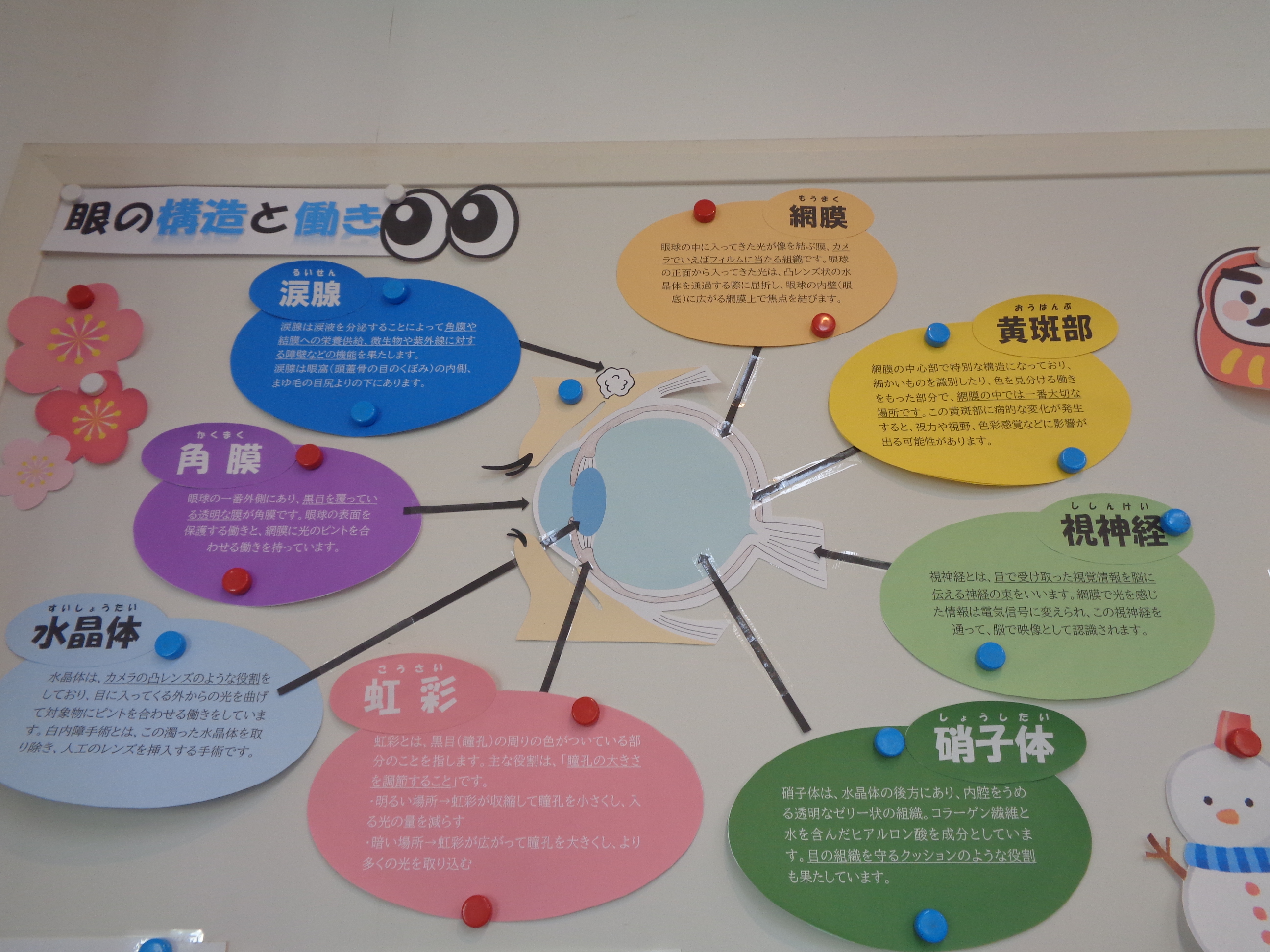 1月より掲示板の内容が変わりました。テーマは、目の構造と働きです。横から見た目の図を元に構造とそれぞれの働きをまとめております。どの部分になるかを矢印で示しています☆1月から3月まで掲示しておりますので待ち時間の合間にぜひご覧ください♪