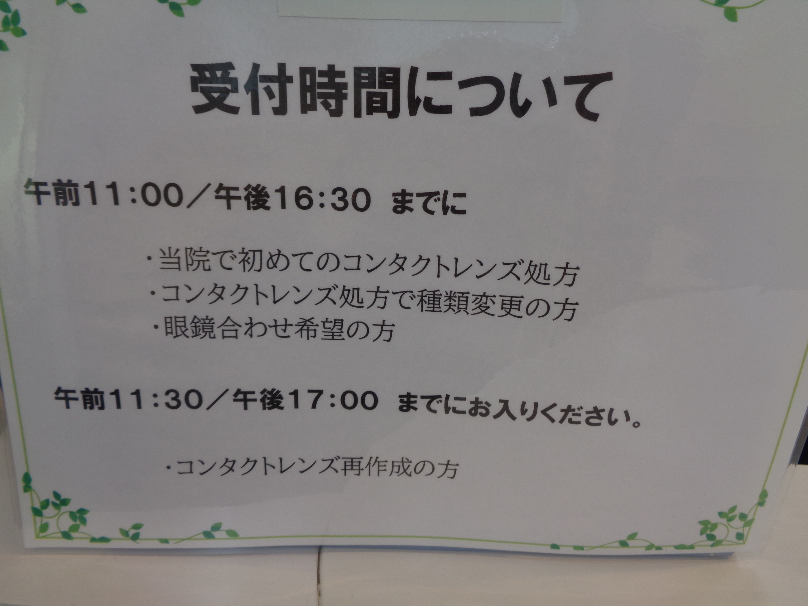 また、コンタクトレンズ再作成(処方)の方も午前11:30/午後17:00までにお入りいただくようご協力をお願い致します。
